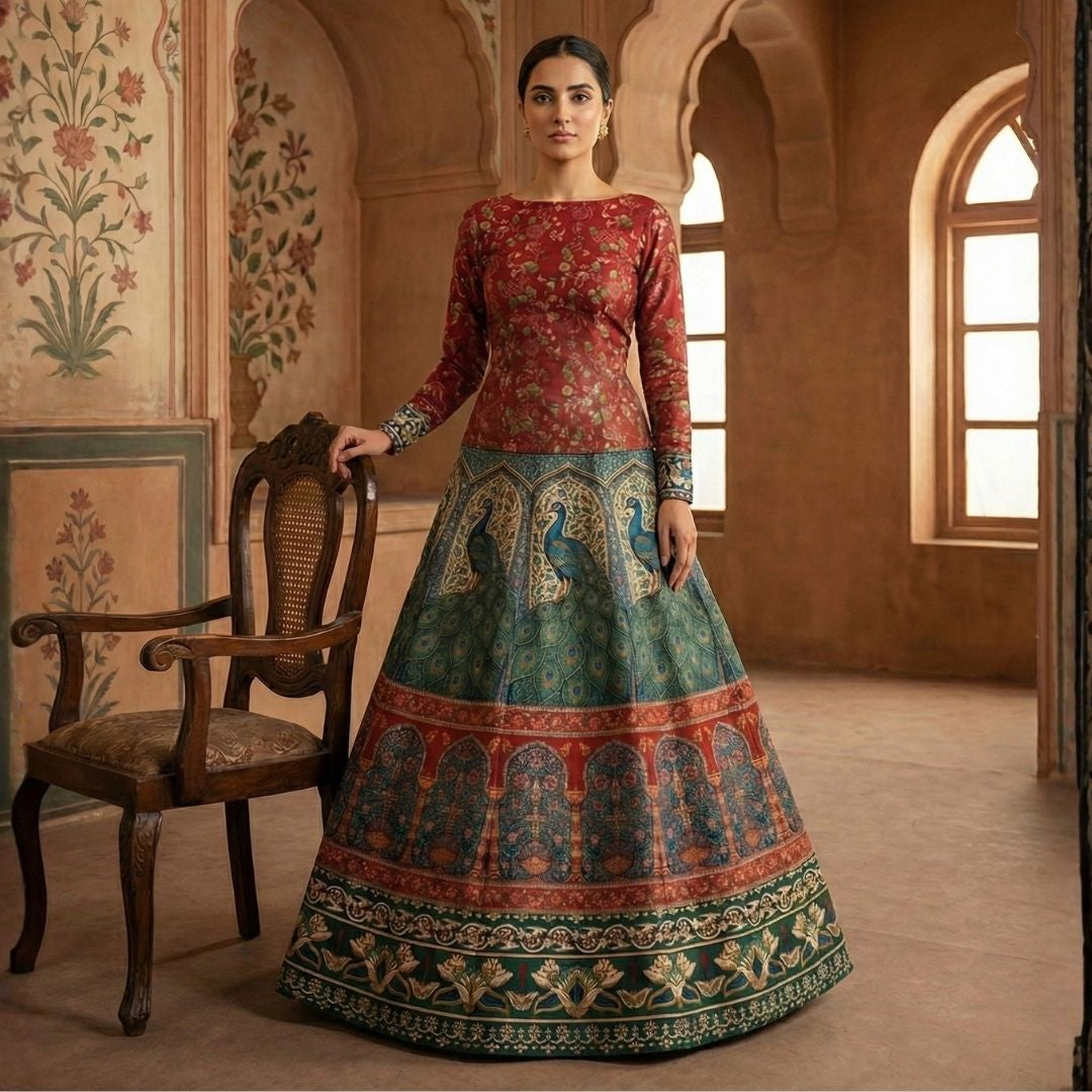 Designed for weddings, receptions, and luxury festive wear, this digitally printed lehenga combines traditional silhouettes with contemporary print aesthetics ideal for designers, boutiques, and custom bridal creations.